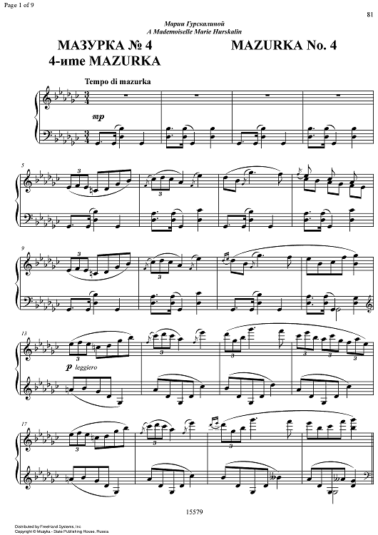 Digital Sheet Music for Mazurka No. 4 by Mily Balakirev scored for Piano Solo; id:337157