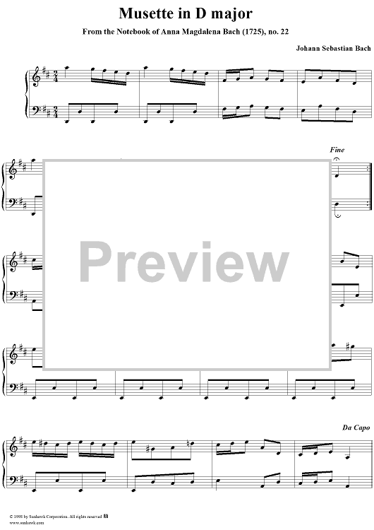 Digital Sheet Music for Musette in D major from the Notebook of Anna Magdelena Bach by Johann Sebastian Bach scored for Piano Solo; id:110885