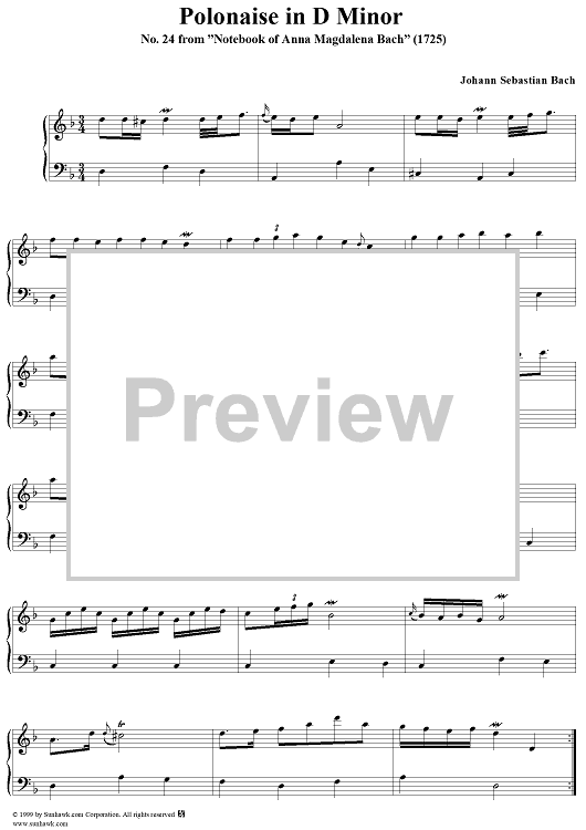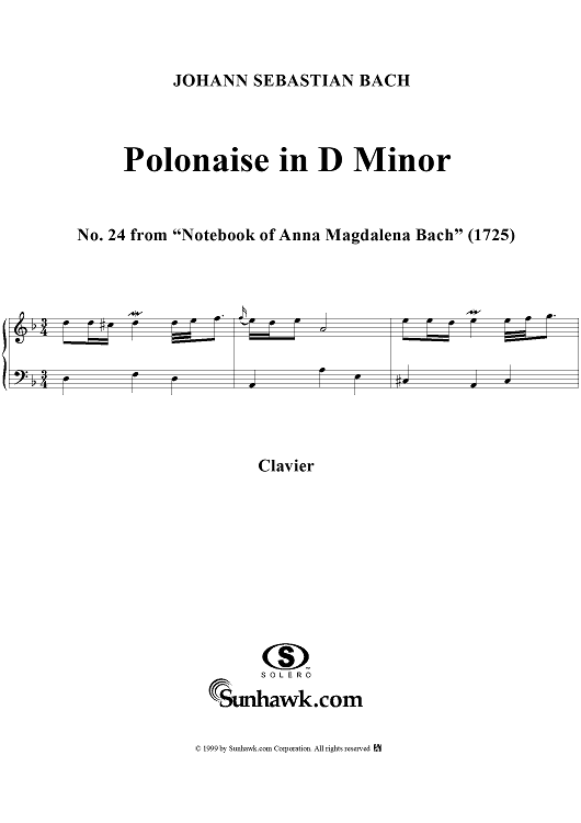 Digital Sheet Music for Polonaise in D Minor from the Notebook of Anna Magdelena Bach by Johann Sebastian Bach scored for Piano Solo; id:241125