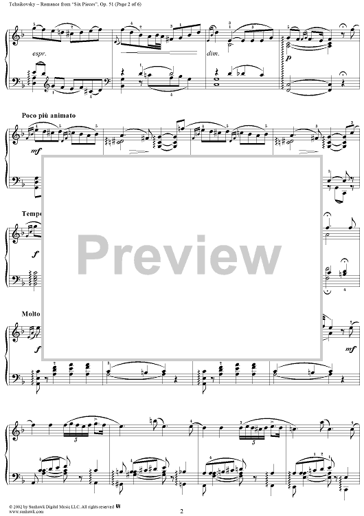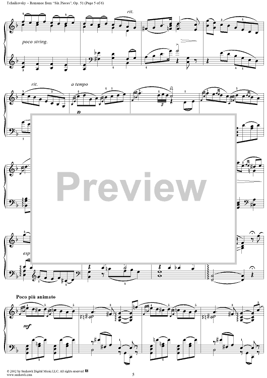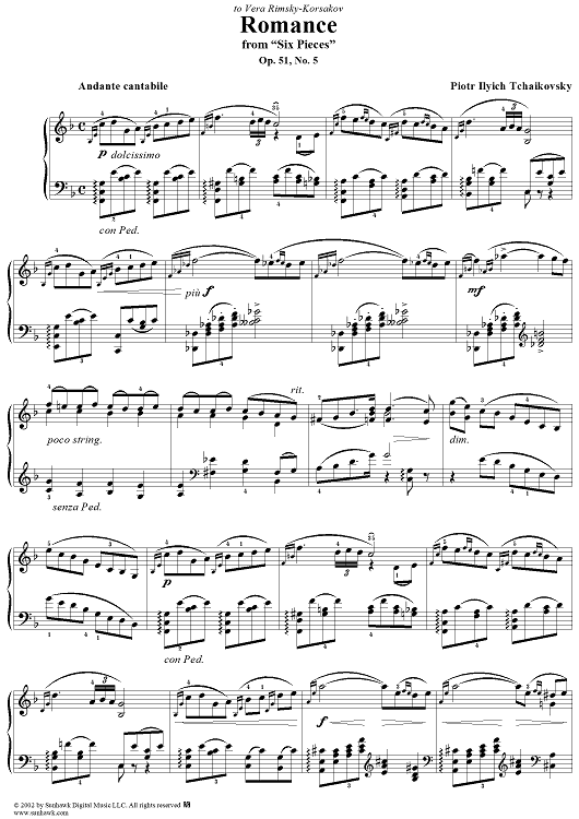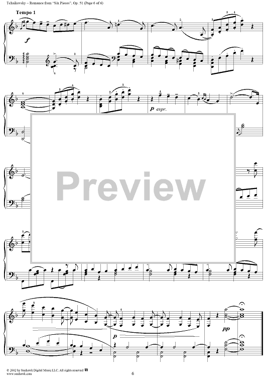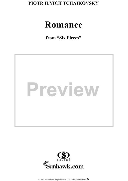 Digital Sheet Music for Six Pieces. No. 5. Romance in F major (F-dur) by Peter Ilyich Tchaikovsky scored for Piano Solo; id:259843