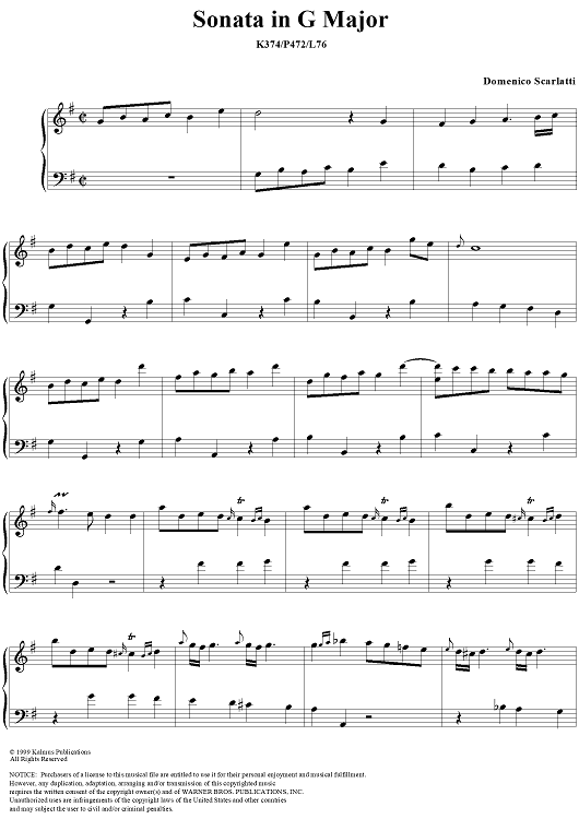 Digital Sheet Music for Sonata in G major - K374/P472/L76 by Domenico Scarlatti scored for Piano Solo; id:257449