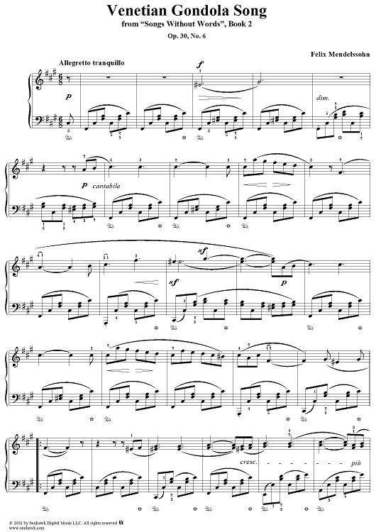 Digital Sheet Music for Songs Without Words, bk. 2, op. 30, no. 6 (Venetian Gondola Song) by Felix Mendelssohn scored for Piano Solo; id:263039