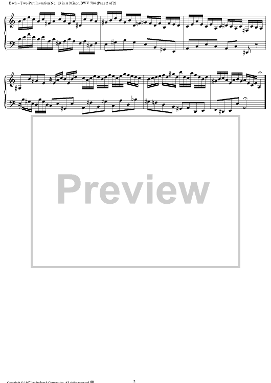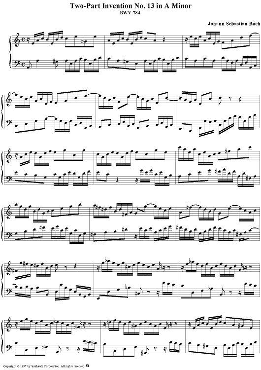 Digital Sheet Music for Two-Part Invention No. 13 in A minor by Johann Sebastian Bach scored for Piano Solo; id:95006