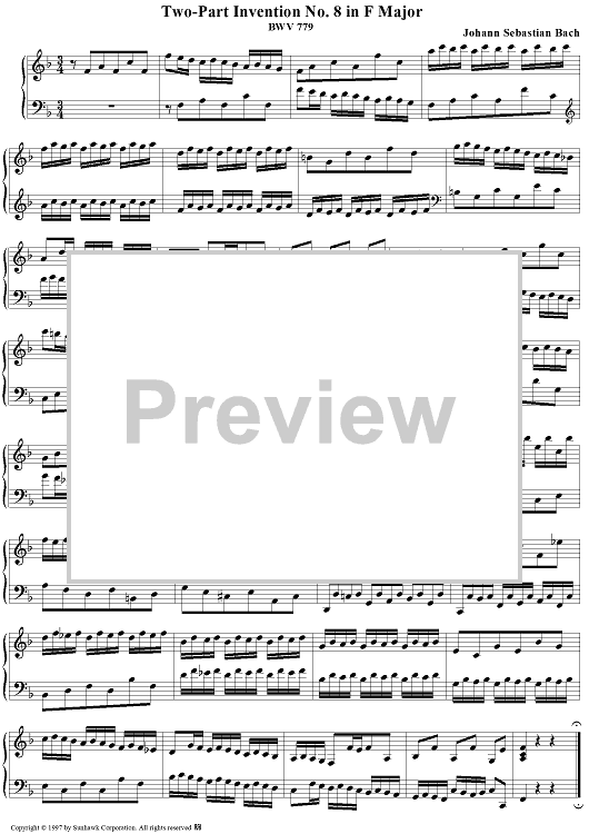 Digital Sheet Music for Two-Part Invention No. 8 in F Major by Johann Sebastian Bach scored for Piano Solo; id:95001