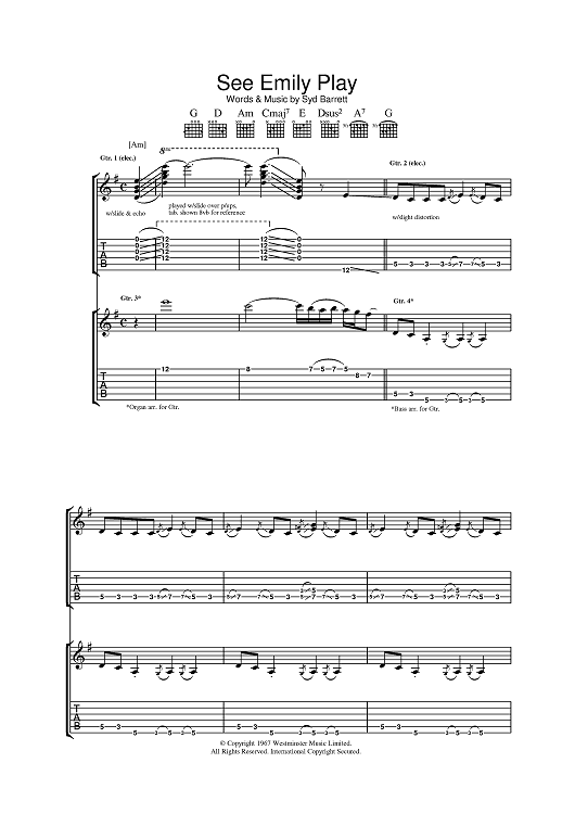 Digital Sheet Music for See Emily Play by Pink Floyd, Syd Barrett scored for Guitar Tab; id:391605