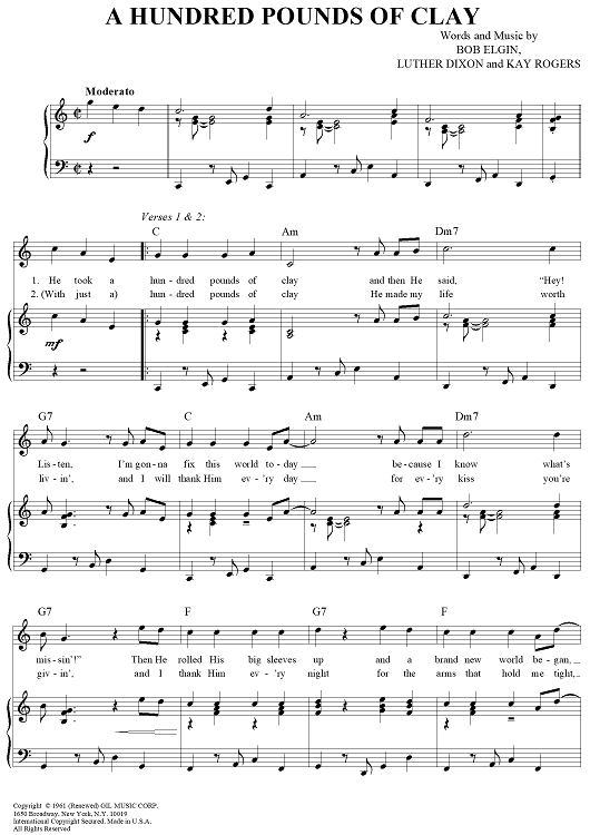 Digital Sheet Music for A Hundred Pounds Of Clay by Luther Dixon, Bob Elgin, Kay Rogers, Gene McDaniels scored for Piano/Vocal/Chords; id:241857