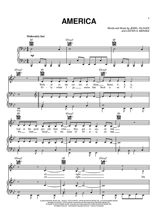 Digital Sheet Music for America by Jewel, Lester Mendez scored for Piano/Vocal/Chords; id:372499