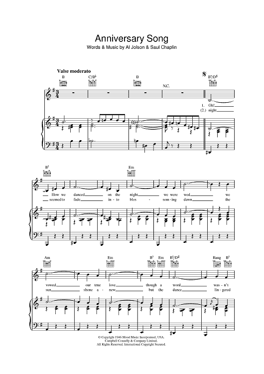 Digital Sheet Music for Anniversary Song by Al Jolson, Saul Chaplin scored for Piano/Vocal/Chords; id:395845