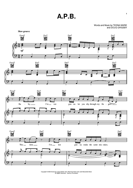 Digital Sheet Music for A.P.B. by Doug Grigsby, Teena Marie scored for Piano/Vocal/Chords; id:394381