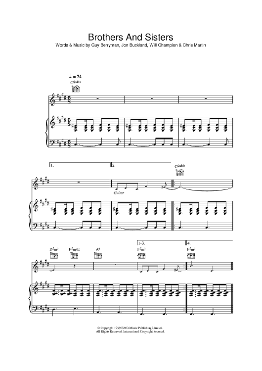 Digital Sheet Music for Brothers And Sisters by Chris Martin, Coldplay, Jonny Buckland, Guy Berryman scored for Piano/Vocal/Chords; id:396819