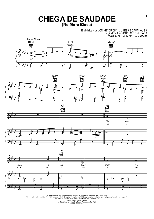 Digital Sheet Music for Chega De Saudade (No More Blues) by Jon Hendricks, Antonio Carlos Jobim, Jessie Cavanaugh, Vinicius de Moraes scored for Piano/Vocal/Chords; id:383981