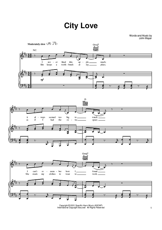 Digital Sheet Music for City Love by John Mayer scored for Piano/Vocal/Chords; id:371465