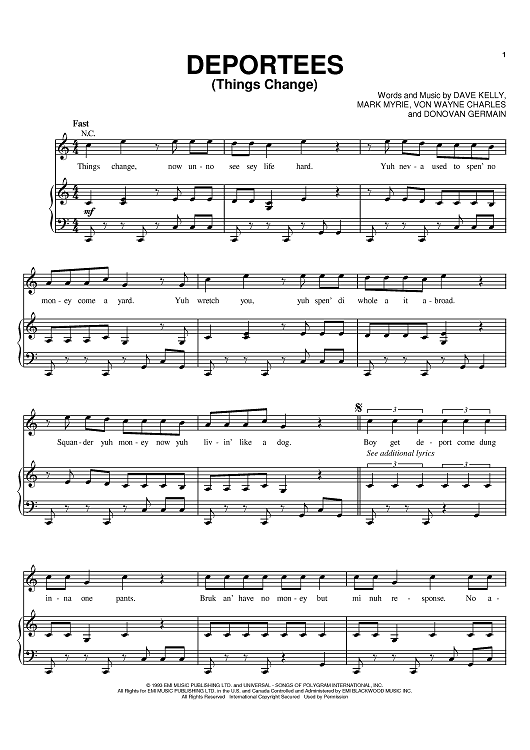 Digital Sheet Music for Deportees (Things Change) by Buju Banton, Wayne Wonder, Donovan Germain, Dave Kelly, Mark Myrie scored for Piano/Vocal/Chords; id:387279