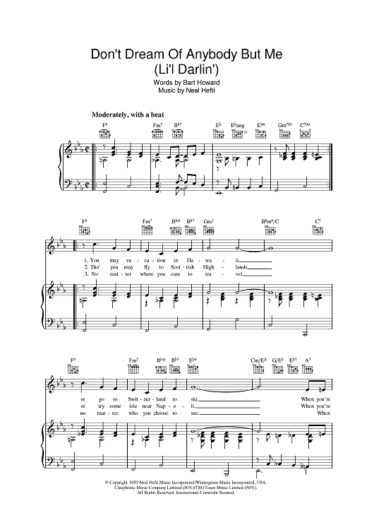 Digital Sheet Music for Don't Dream Of Anybody But Me (Li'l Darlin') by Bart Howard, Neal Hefti scored for Piano/Vocal/Chords; id:394997