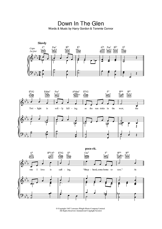Digital Sheet Music for Down In The Glen by Tommie Connor, Harry Gordon scored for Piano/Vocal/Chords; id:394448