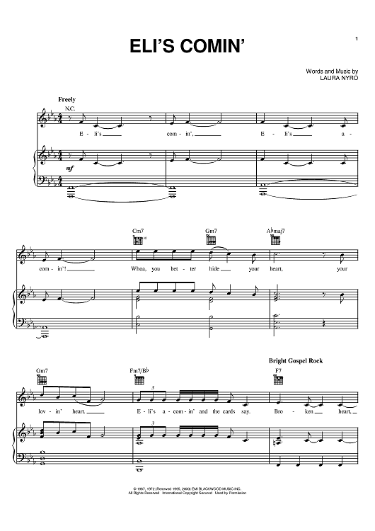 Digital Sheet Music for Eli's Comin' by Three Dog Night, Laura Nyro scored for Piano/Vocal/Chords; id:368046