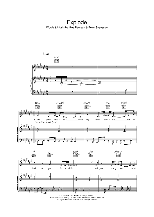 Digital Sheet Music for Explode by Nina Persson, Peter Svensson, The Cardigans scored for Piano/Vocal/Chords; id:383891