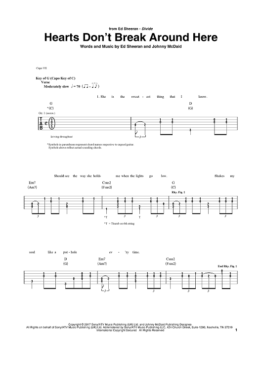 Digital Sheet Music for Hearts Don't Break Around Here by Ed Sheeran, John McDaid scored for Guitar Tab/Vocal/Chords; id:464599
