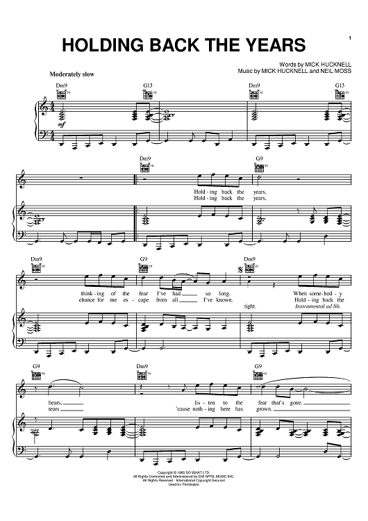 Digital Sheet Music for Holding Back The Years by Mick Hucknall, Simply Red, Neil Moss scored for Piano/Vocal/Chords; id:394539