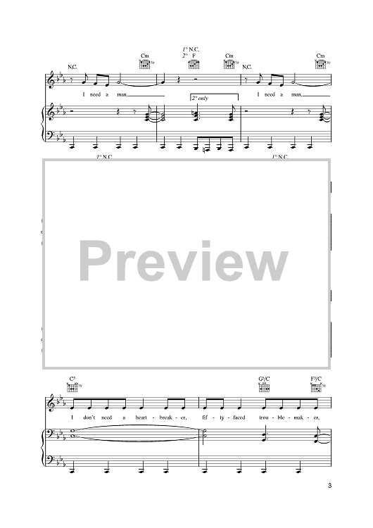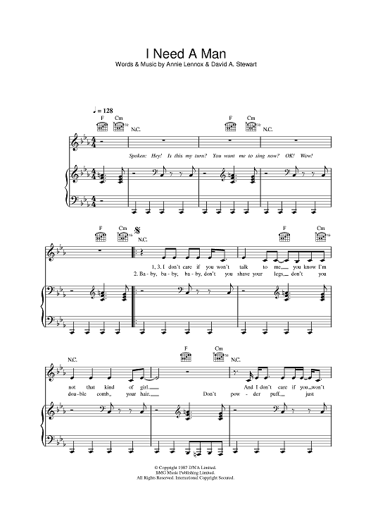 Digital Sheet Music for I Need A Man by Annie Lennox, Dave Stewart, Eurythmics scored for Piano/Vocal/Chords; id:401326