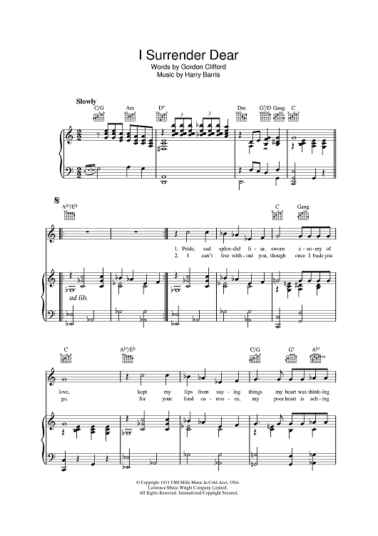 Digital Sheet Music for I Surrender, Dear by Harry Barris, Gordon Clifford scored for Piano/Vocal/Chords; id:395704