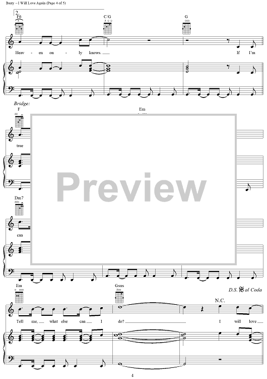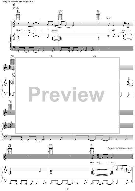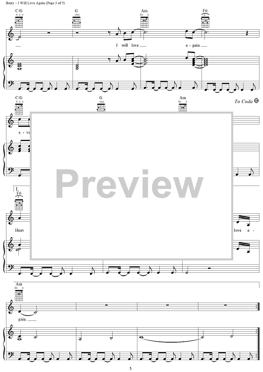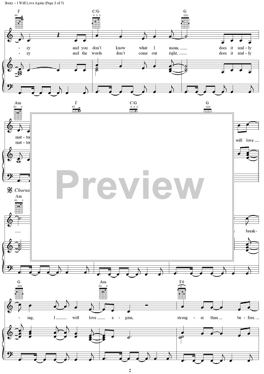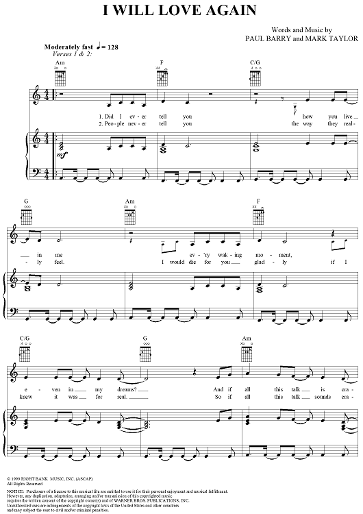 Digital Sheet Music for I Will Love Again by Timothy Gatlin, Mark Taylor, Lara Fabian scored for Piano/Vocal/Chords; id:241018