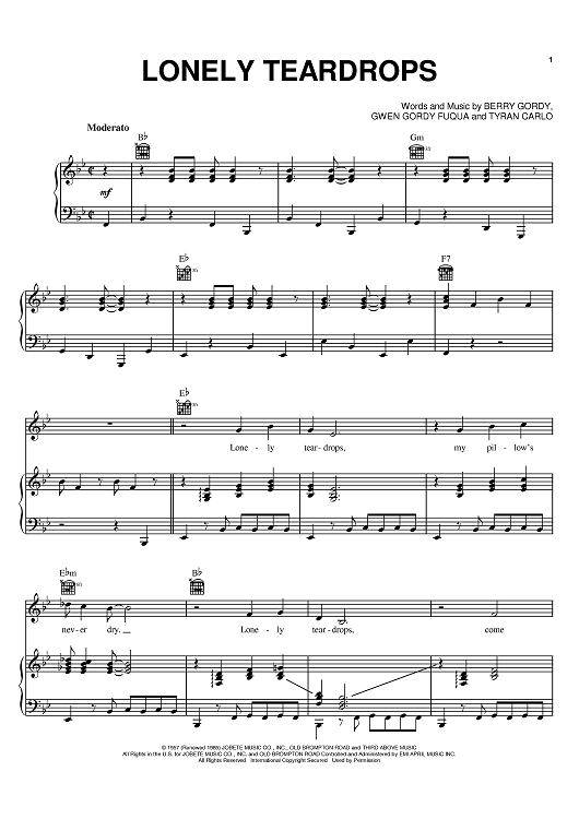 Digital Sheet Music for Lonely Teardrops by Jackie Wilson, Berry Gordy Jr., Tyran Carlo, Gwen Gordy Fuqua scored for Piano/Vocal/Chords; id:395159