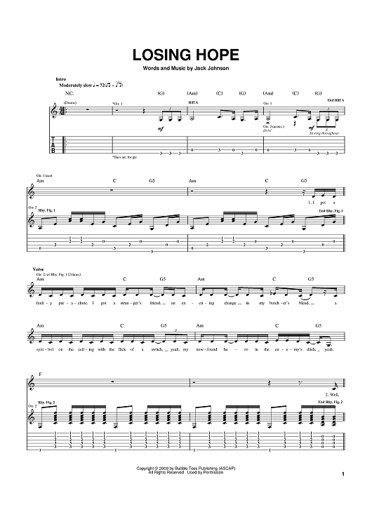 Digital Sheet Music for Losing Hope by Jack Johnson scored for Guitar Tab; id:370632