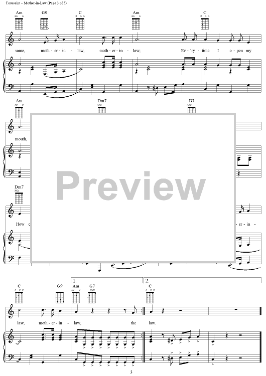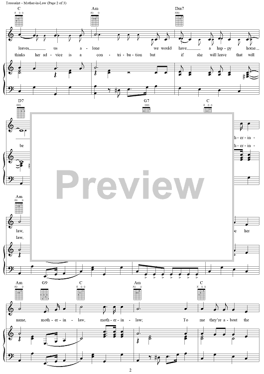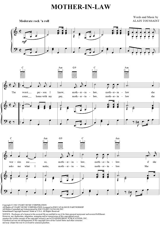 Digital Sheet Music for Mother-in-Law by Allen Toussaint, Ernie K-Doe scored for Piano/Vocal/Chords; id:260365