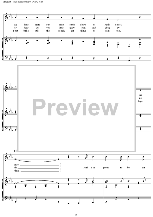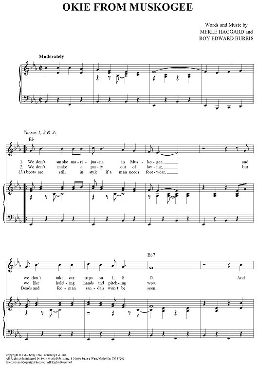 Digital Sheet Music for Okie from Muskogee by Roy Edward Burris, Merle Haggard scored for Piano/Vocal/Chords; id:361820