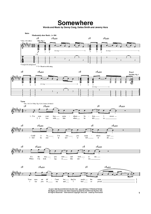 Digital Sheet Music for Somewhere by Danny Craig, Default, Jeremy Hora, Dallas Smith scored for Guitar Tab; id:367832