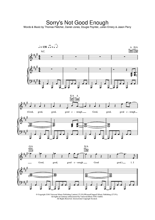 Digital Sheet Music for Sorry's Not Good Enough by Daniel Jones, Jason Perry, Tom Fletcher, McFly, Julien Emery, Dougie Poynter scored for Piano/Vocal/Chords; id:395728