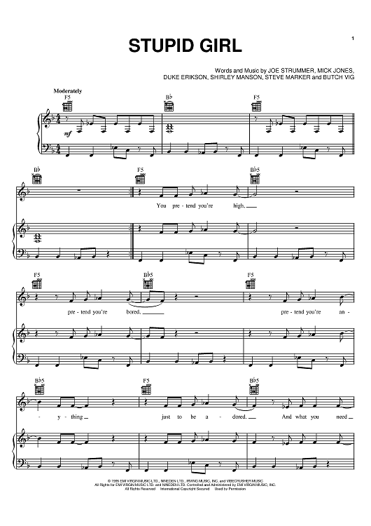 Digital Sheet Music for Stupid Girl by Garbage, Butch Vig, Joe Strummer, Duke Erikson scored for Piano/Vocal/Chords; id:368650
