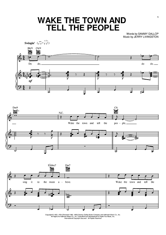 Digital Sheet Music for Wake The Town And Tell The People by Jerry Livingston, Sammy Gallop, Les Baxter scored for Piano/Vocal/Chords; id:395174