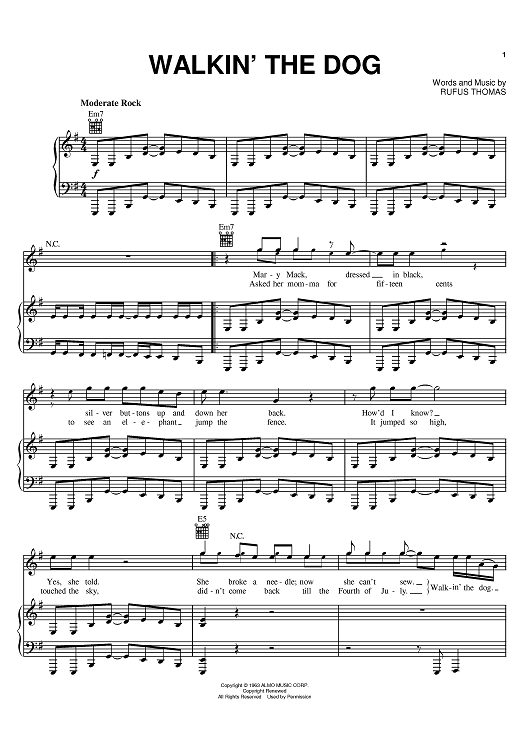 Digital Sheet Music for Walkin' The Dog by Rufus Thomas scored for Piano/Vocal/Chords; id:367517