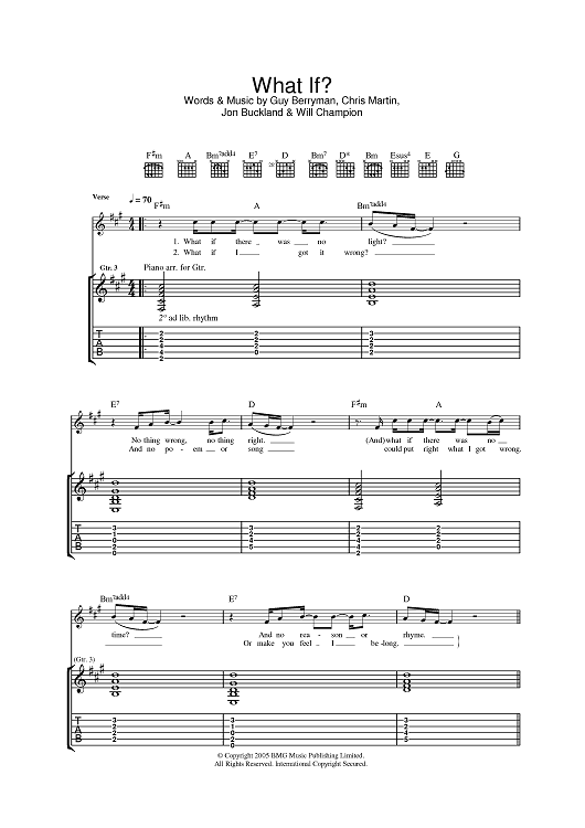 Digital Sheet Music for What If? by Chris Martin, Coldplay, Jonny Buckland, Guy Berryman scored for Guitar Tab; id:384547