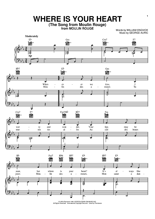 Digital Sheet Music for Where Is Your Heart by Percy Faith, Georges Auric, William Engvick scored for Piano/Vocal/Chords; id:395203