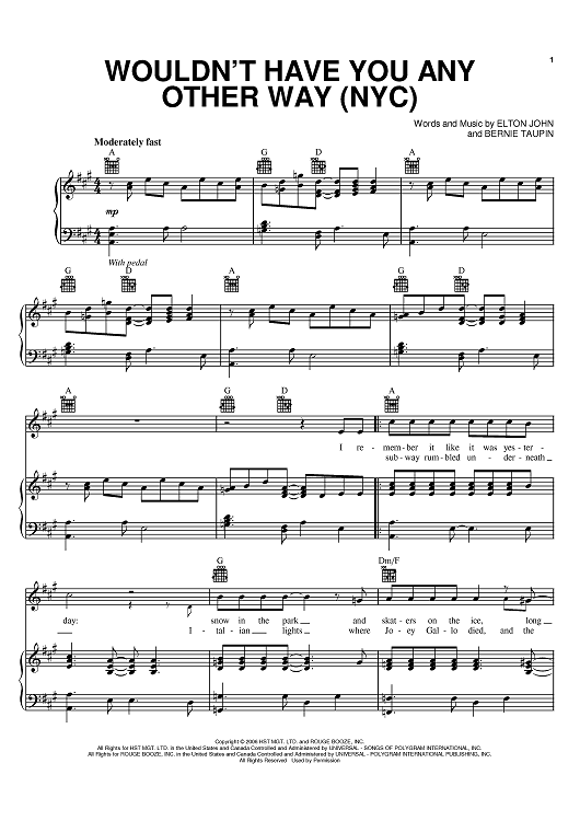 Digital Sheet Music for Wouldn't Have You Any Other Way (NYC) by Elton John, Bernie Taupin scored for Piano/Vocal/Chords; id:396318