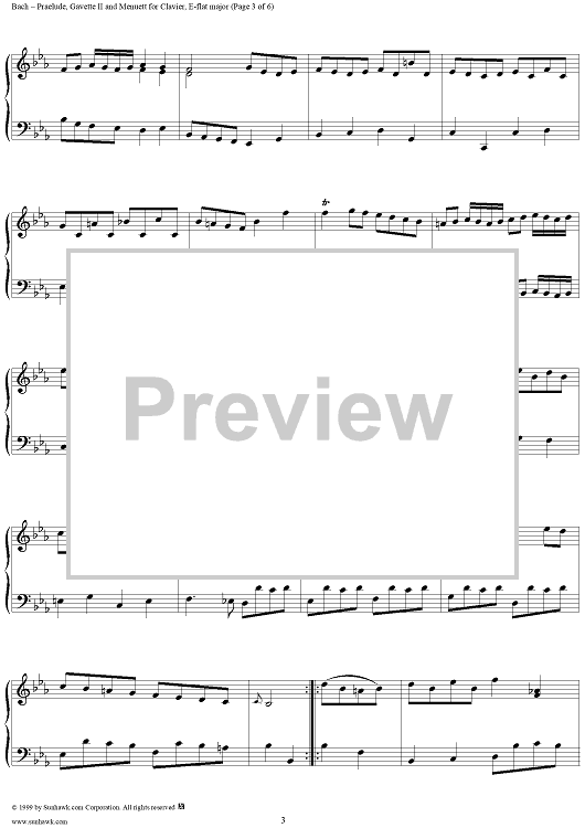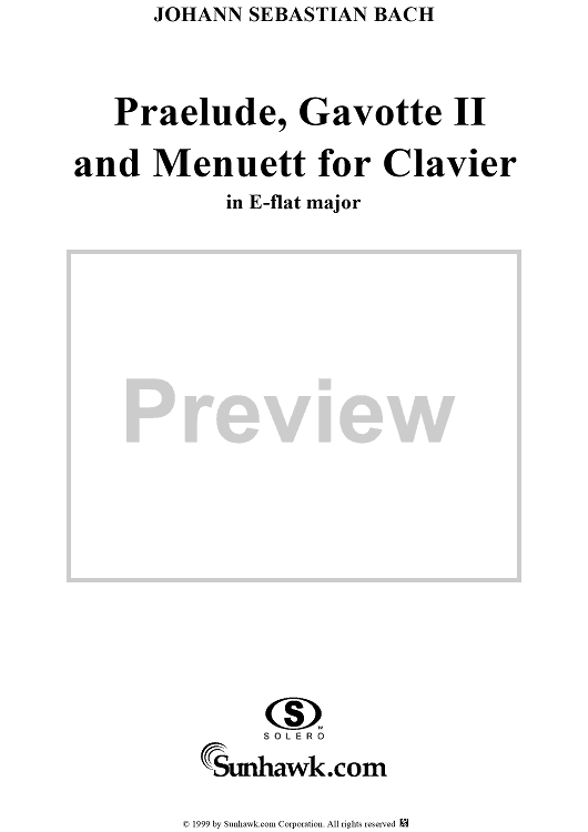 Digital Sheet Music for Praelude, Gavotte II, and Menuett for Clavier in E-Flat Major (BWV 815) by Johann Sebastian Bach scored for Piano Solo; id:241501