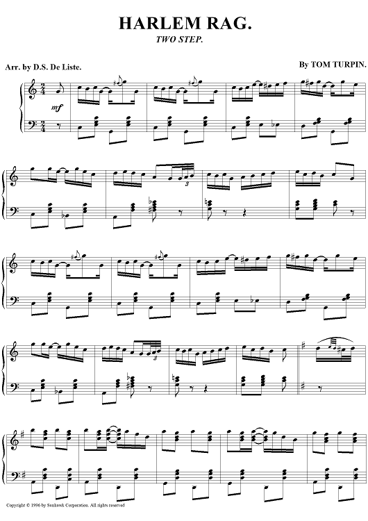 Digital Sheet Music for Harlem Rag by Tom Turpin, D. S. De Liste scored for Piano Solo; id:118322