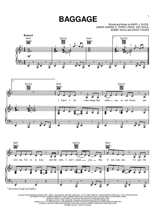 Digital Sheet Music for Baggage by Jimmy Jam, Terry Lewis, Mary J. Blige, David Young, Bobby Ross Avila Jr., Izzy Avila scored for Piano/Vocal/Chords; id:395047