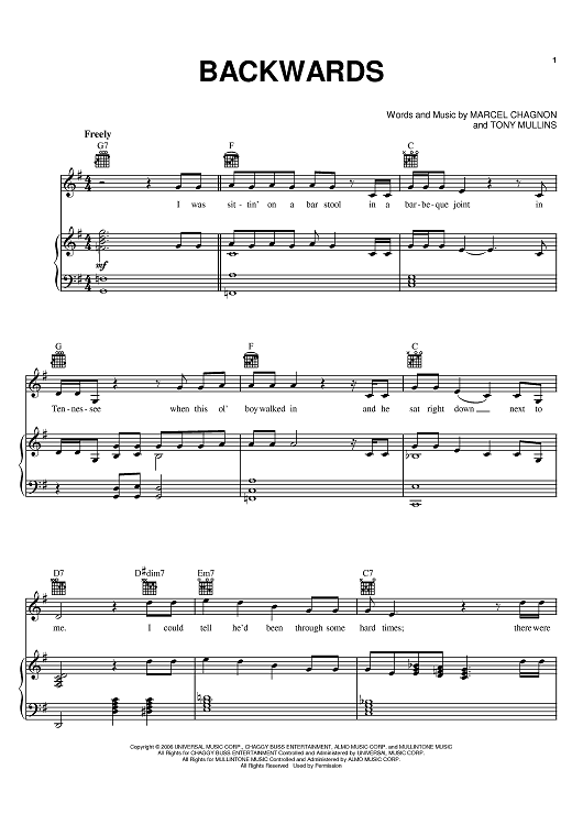 Digital Sheet Music for Backwards by Tony Mullins, Rascal Flatts, Marcel Chagnon scored for Piano/Vocal/Chords; id:392802