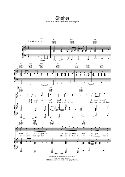 Digital Sheet Music for Shelter by Ray LaMontagne scored for Piano/Vocal/Chords; id:397068