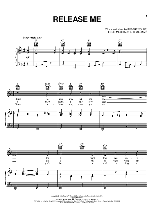 Digital Sheet Music for Release Me by Tom Jones, Ray Price, Kitty Wells, Engelbert Humperdinck, Eddie Miller, Dub Williams, Robert Yount, Johnny Adams, Dolly Parton scored for Piano/Vocal/Chords; id:383358
