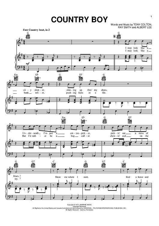 Digital Sheet Music for Country Boy by Albert Lee, Ricky Skaggs, Tony Colton, Ray Smith scored for Piano/Vocal/Chords; id:381937