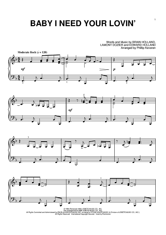 Digital Sheet Music for Baby I Need Your Lovin' by Four Tops, Lamont Dozier, Johnny Rivers, Brian Holland, Eddie Holland, Phillip Keveren, O. C. Smith scored for Piano; id:392196