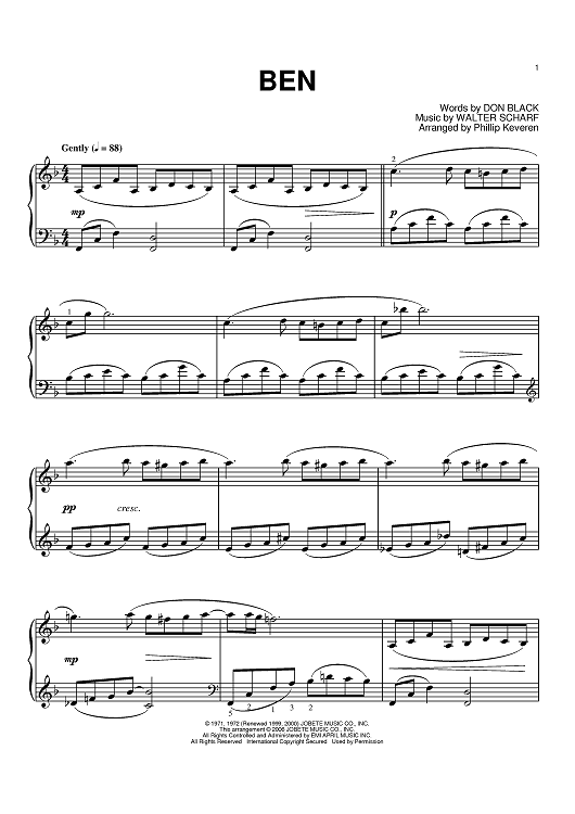 Digital Sheet Music for Ben by Don Black, Michael Jackson, Walter Scharf, Phillip Keveren scored for Piano; id:392197