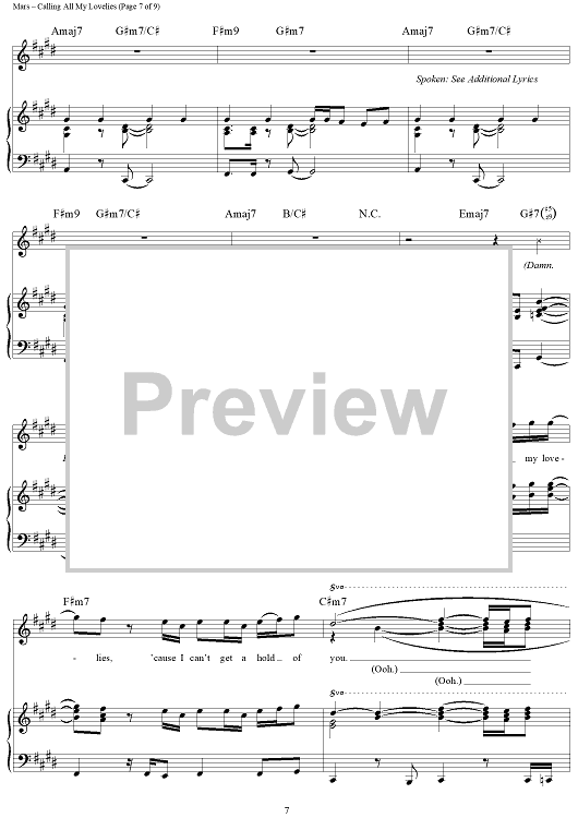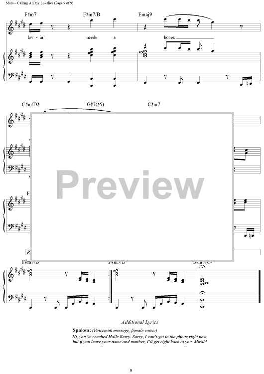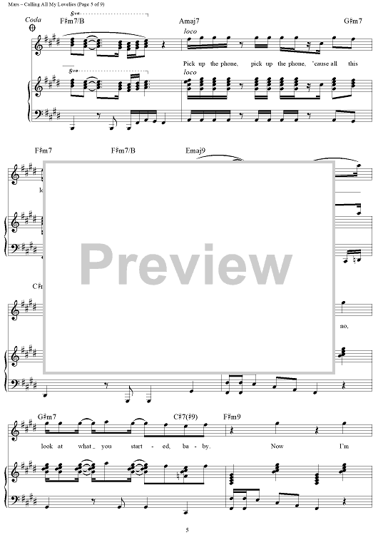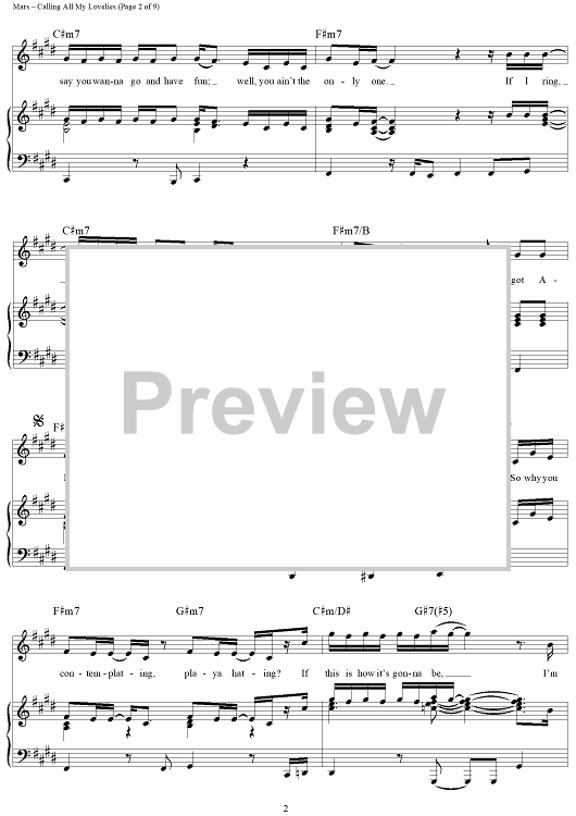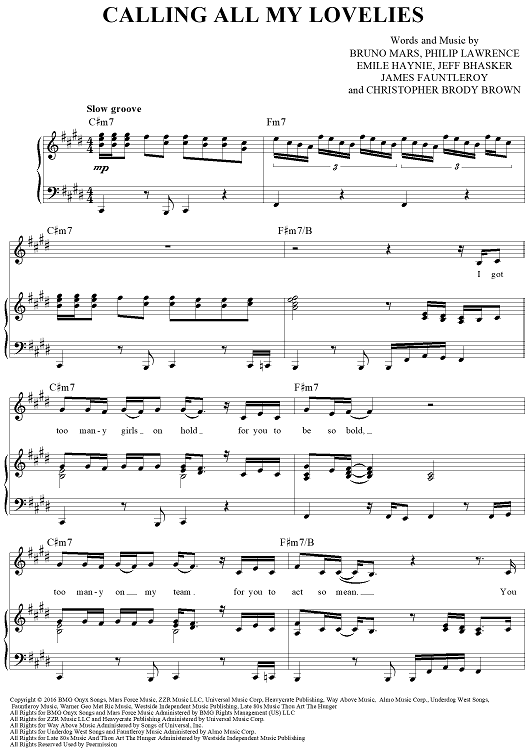 Digital Sheet Music for Calling All My Lovelies by Philip Lawrence, Bruno Mars, Jeff Bhasker, James Fauntleroy II, Emile Haynie scored for Piano/Vocal/Chords; id:464610