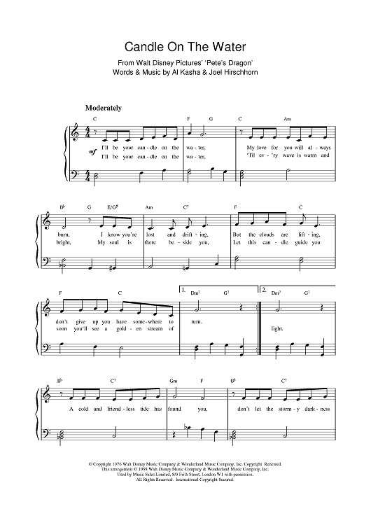 Digital Sheet Music for Candle On The Water by Al Kasha, J Hirschhorn scored for Piano; id:376257