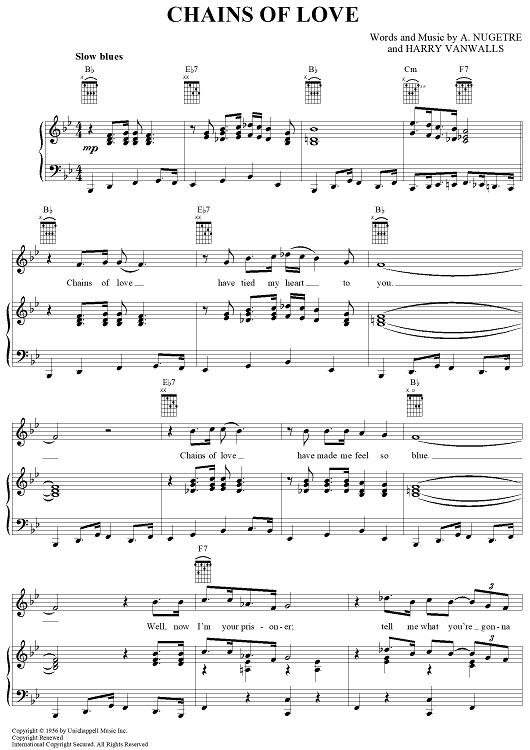 Digital Sheet Music for Chains Of Love by Pat Boone, A. Nugetre, Big Joe Turner, Harry Vanwalls, Bobby "Blue" Bland scored for Piano/Vocal/Chords; id:367538